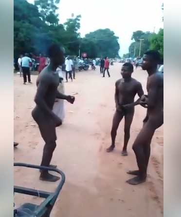 A video clip has emerged on social media, showing the shocking moment some local thieves who were caught in the act, were made to dance n*ked in public.